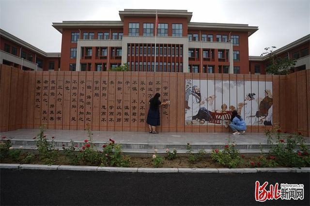 8月29日,在河北省邢台经济开发区东华路实验小学,老师正在清洁文化墙。