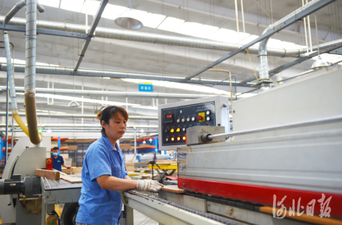 河北蓝鸟家具股份有限公司工人在利用加工中心生产家具部件。