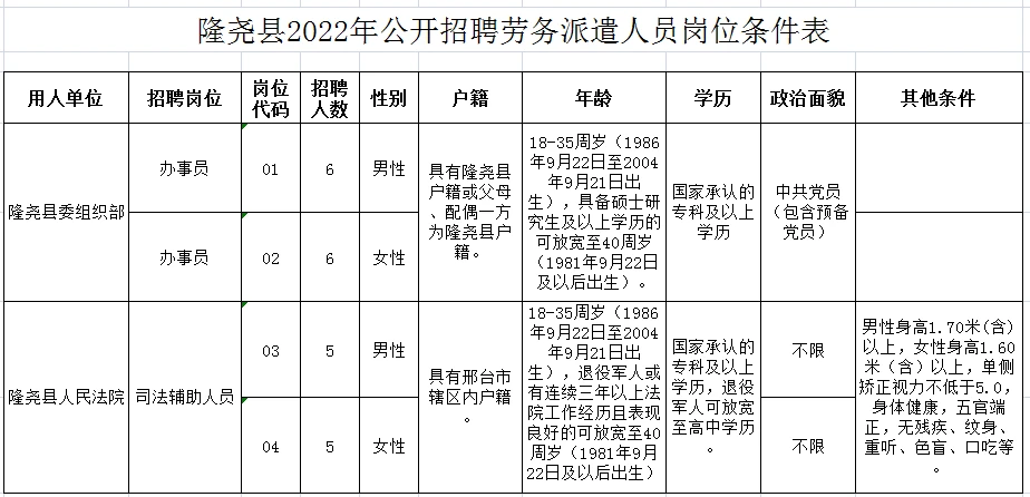 具体招聘人数和岗位条件详见《隆尧县2022年公开招聘劳务派遣人员岗位条件表》,凡涉及到年龄、户籍、工作经历等需要确定时间的,计算日期截止到2022年9月21日。