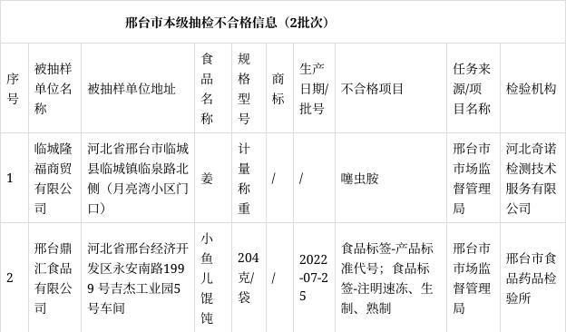 邢台市市场监管局抽检181批次食品 不合格样品2批次