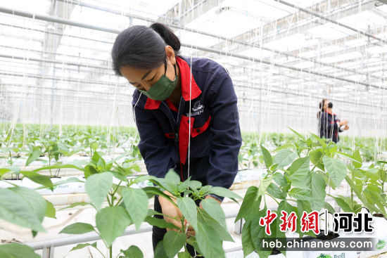 在河北省邢台市南和区贾宋镇一家现代农业园区,工人正在管护彩椒秧苗。